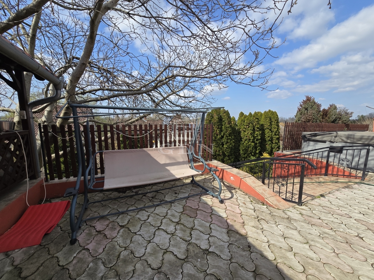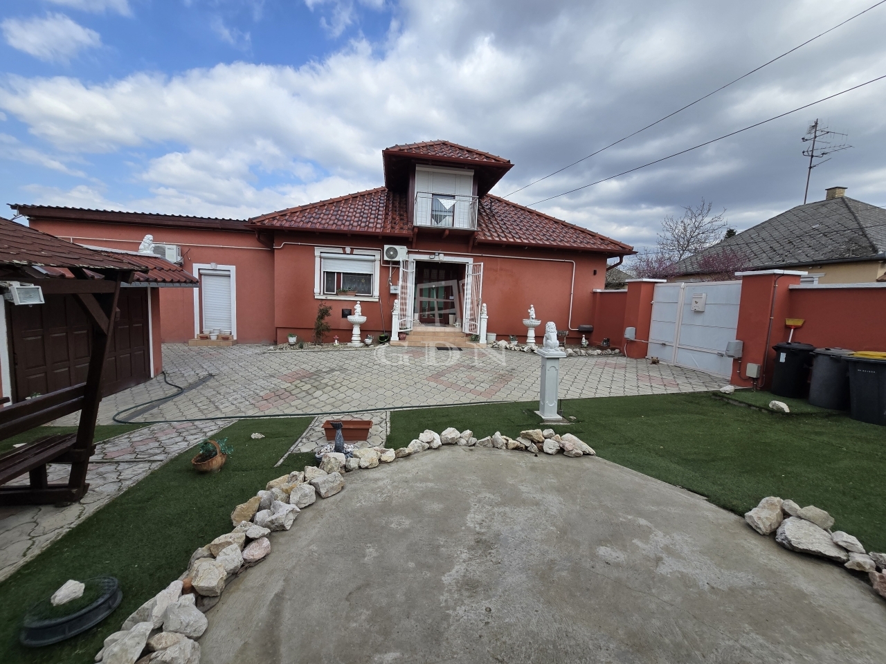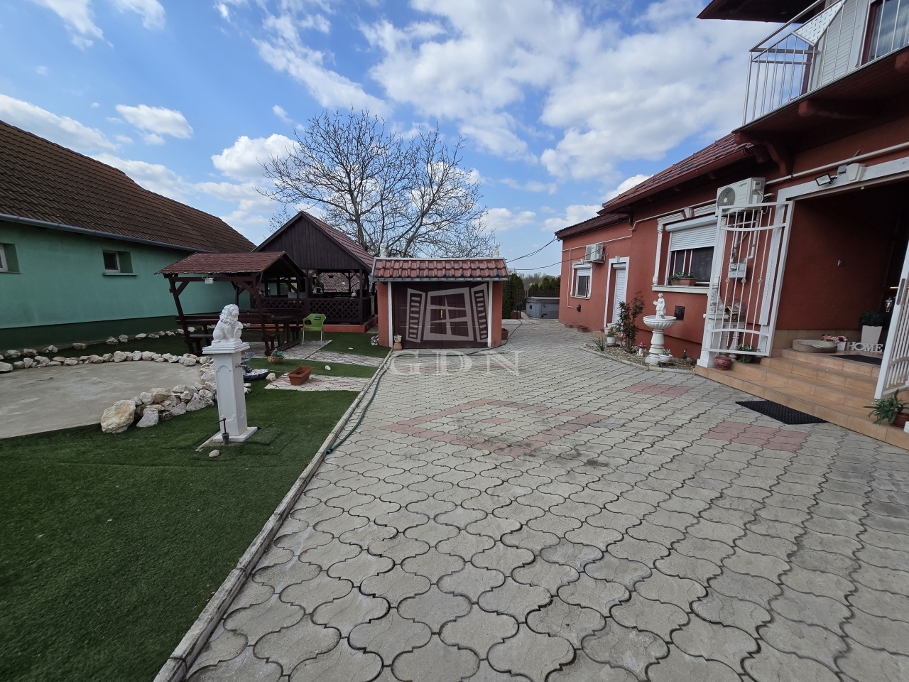 Az alsó udvar szintén részben térkövezett, és külön utcáról is megközelíthető. Itt két fedett gépkocsibeálló került kialakításra, amelyek alatt akár több jármű parkolása is kényelmesen megoldható, így az ingatlan nemcsak nagycsaládosok számára ideális, hanem akár vállalkozási vagy befektetési célra – például szállásadásra – is kiváló lehetőséget kínál.