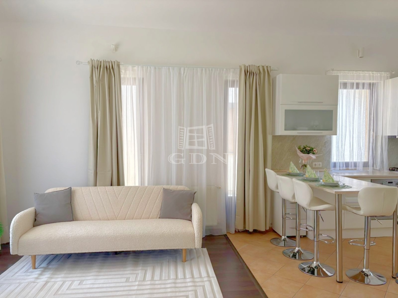 A földszinten egy tágas, világos nappali-étkező található amerikai konyhával, közvetlen kijárattal a fedett teraszra, ahonnan a gondosan kialakított, privát kertre nyílik kilátás. Ezen a szinten kapott helyet egy hálószoba gardróbbal, egy fürdőszoba, valamint egy zárt garázs is.