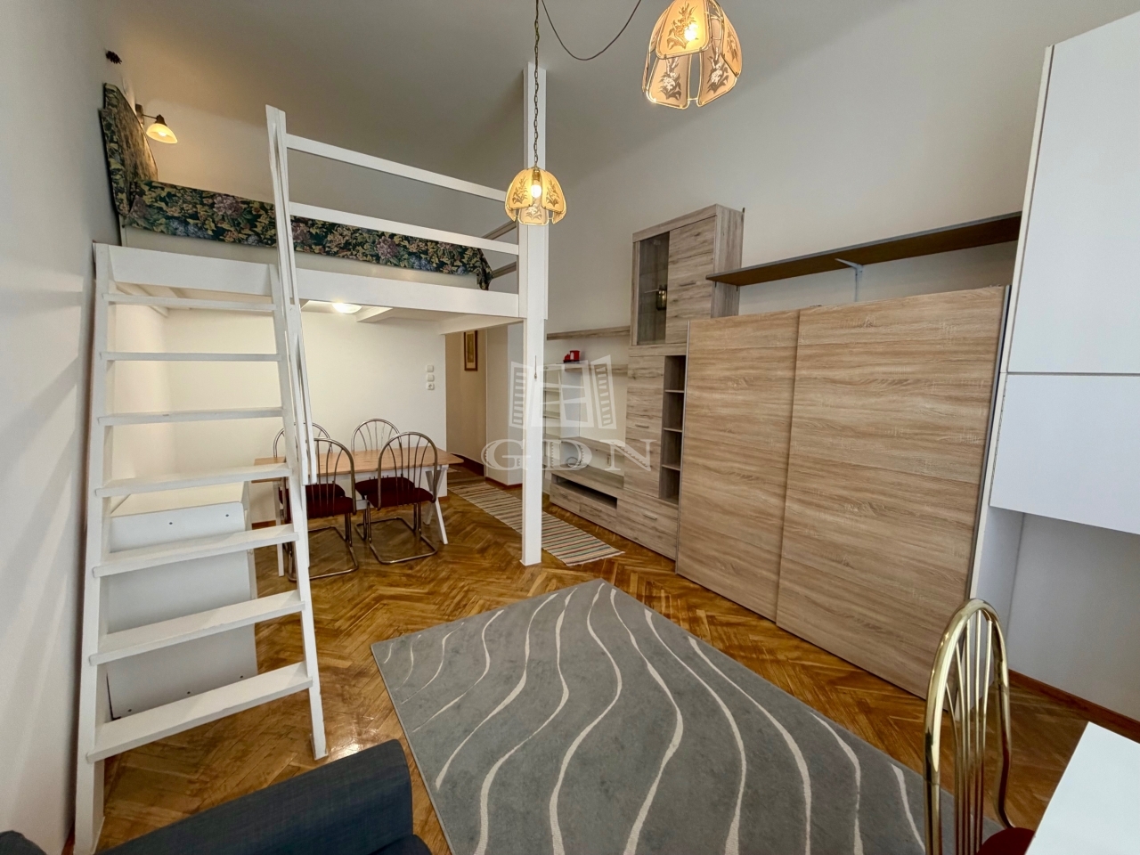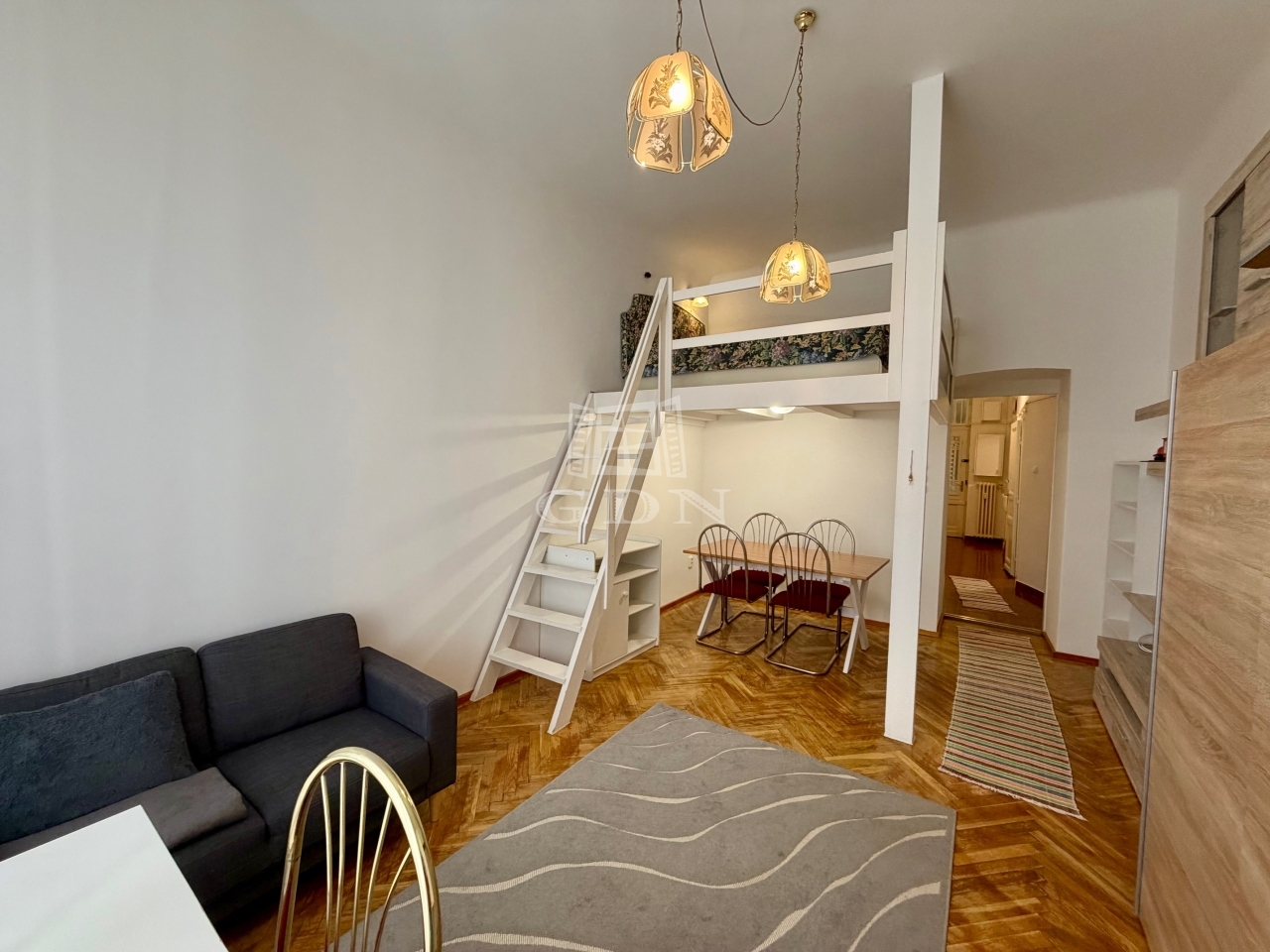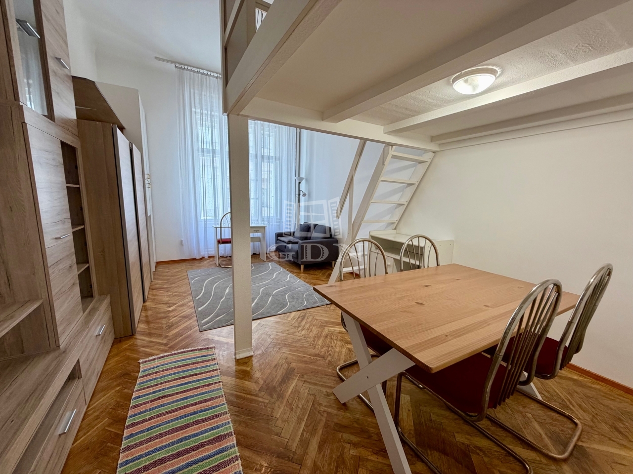Kiadó Budapesten a belvárosban, a Honvéd utcában lévő, egy szobás, galériás, bútorozott, gépiesített, kis lakás!