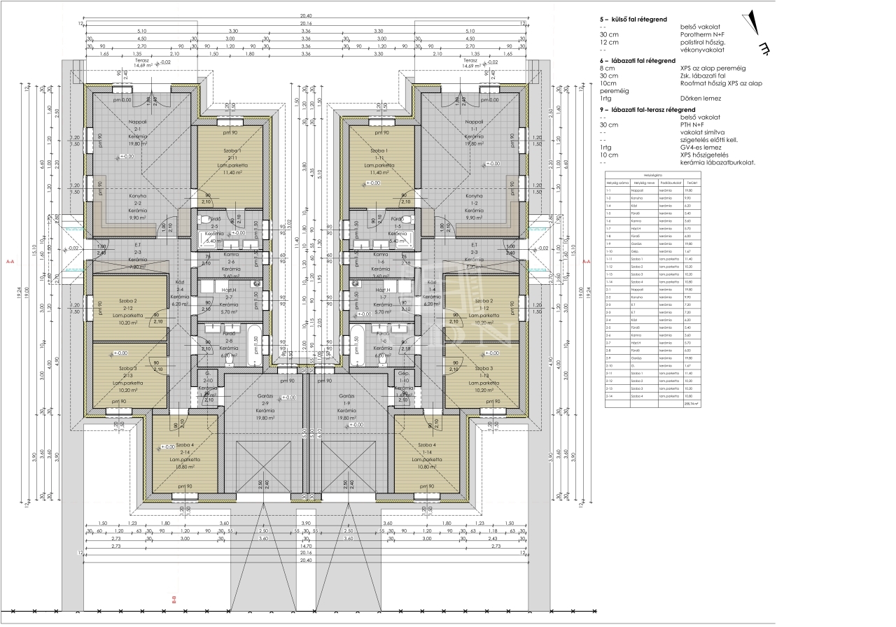 Mindkét házrész nettó 128 m²-es, azonos méretű 541 m²-es kizárólagos használatú telekrészekkel, 4 külön hálószobával, amerikai konyhás nappalival, illetve két fürdőszobával és egy 19,8 m²-es garázzsal.