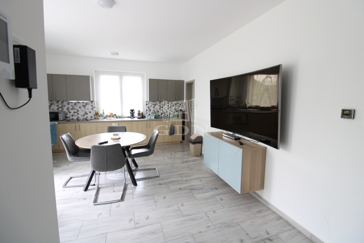 Földszintre egy 3,88nm-es szélfogón keresztül juthatunk be. Ezen a szinten 21,5nm nagyságú amerikai konyhás nappali, valamint az ehhez tartozó 3,98nm-es kamra, 24,3nm terjedelmű hatalmas világos szoba, (jelenleg ez a helység kettő egyenként 12 és 9nm-es szobára lett átalakítva) 7,9nm-es fürdőszoba, 1,6nm-es külön helyiségben kialakított WC és kézmosó, 4,4nm-es közlekedő, valamint 8nm nagyságú lépcsőház lett kialakítva. Ebből a lépcsőházból juthatunk le a szuterén részbe, illetve a felső szintre.