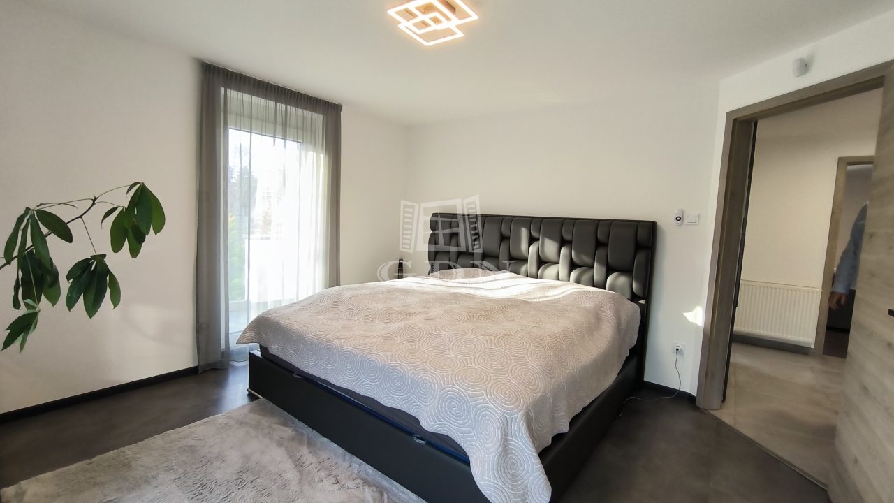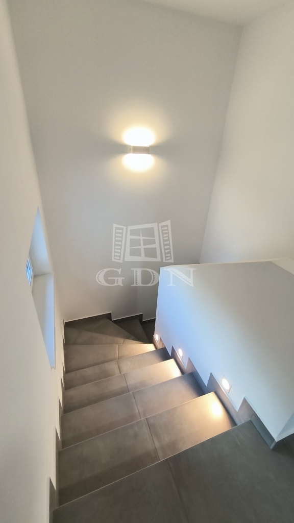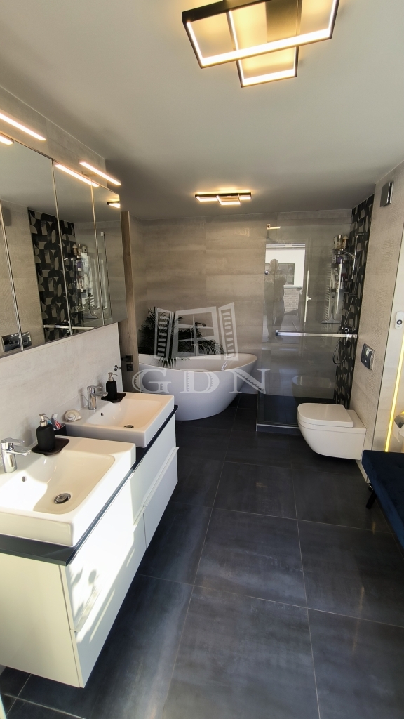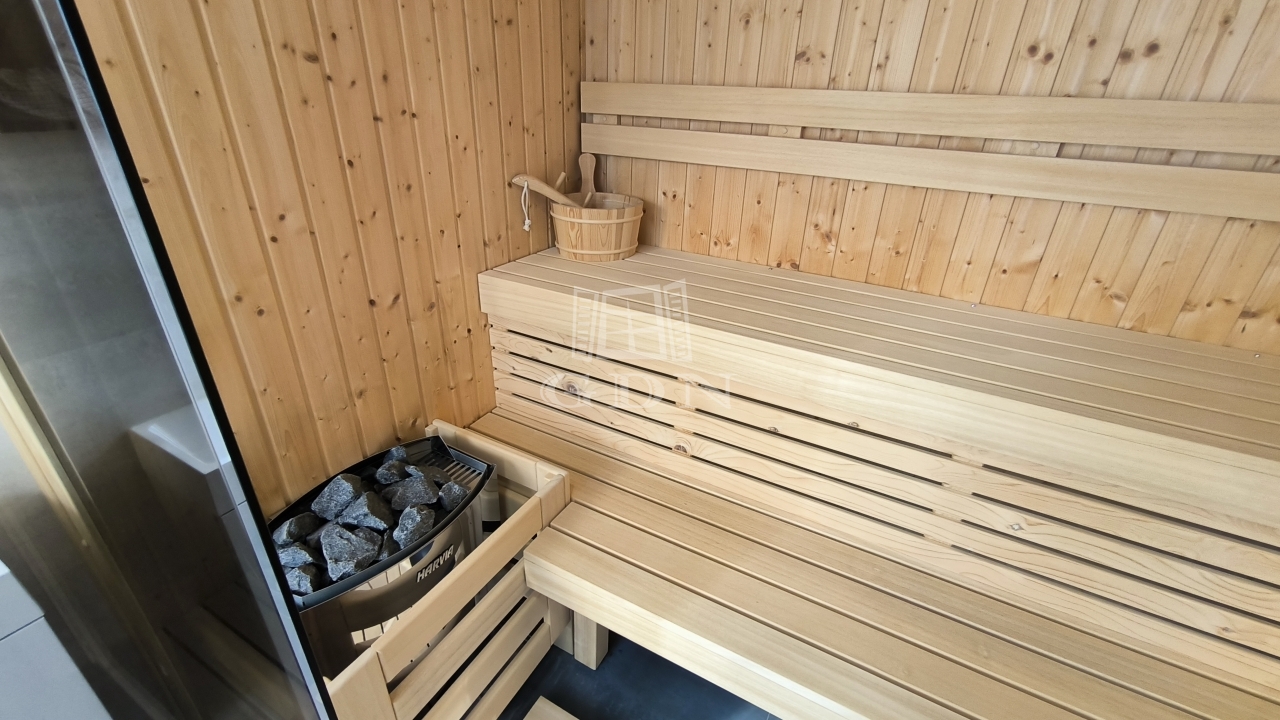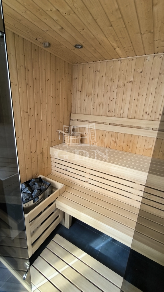 A földszinten az amerikai konyhás nappali mellett van még egy háló és egy fürdőszoba is, a lépcső alatt kis tároló. A nappaliból kilépve érünk a 34 négyzetméteres teraszra, az intimitást biztosító, karbantartott kertbe. Az emeleten 3 háló ( 2 teraszos), egy fürdő és a szauna helység található zuhanyzóval.