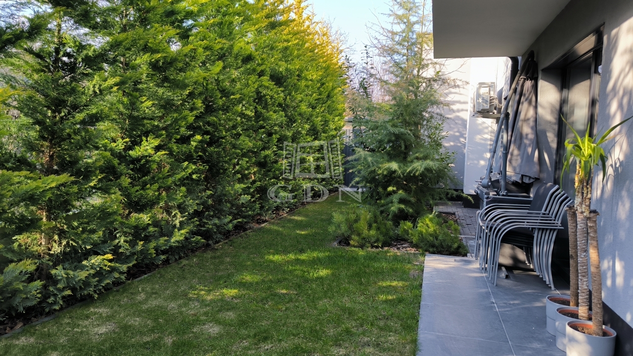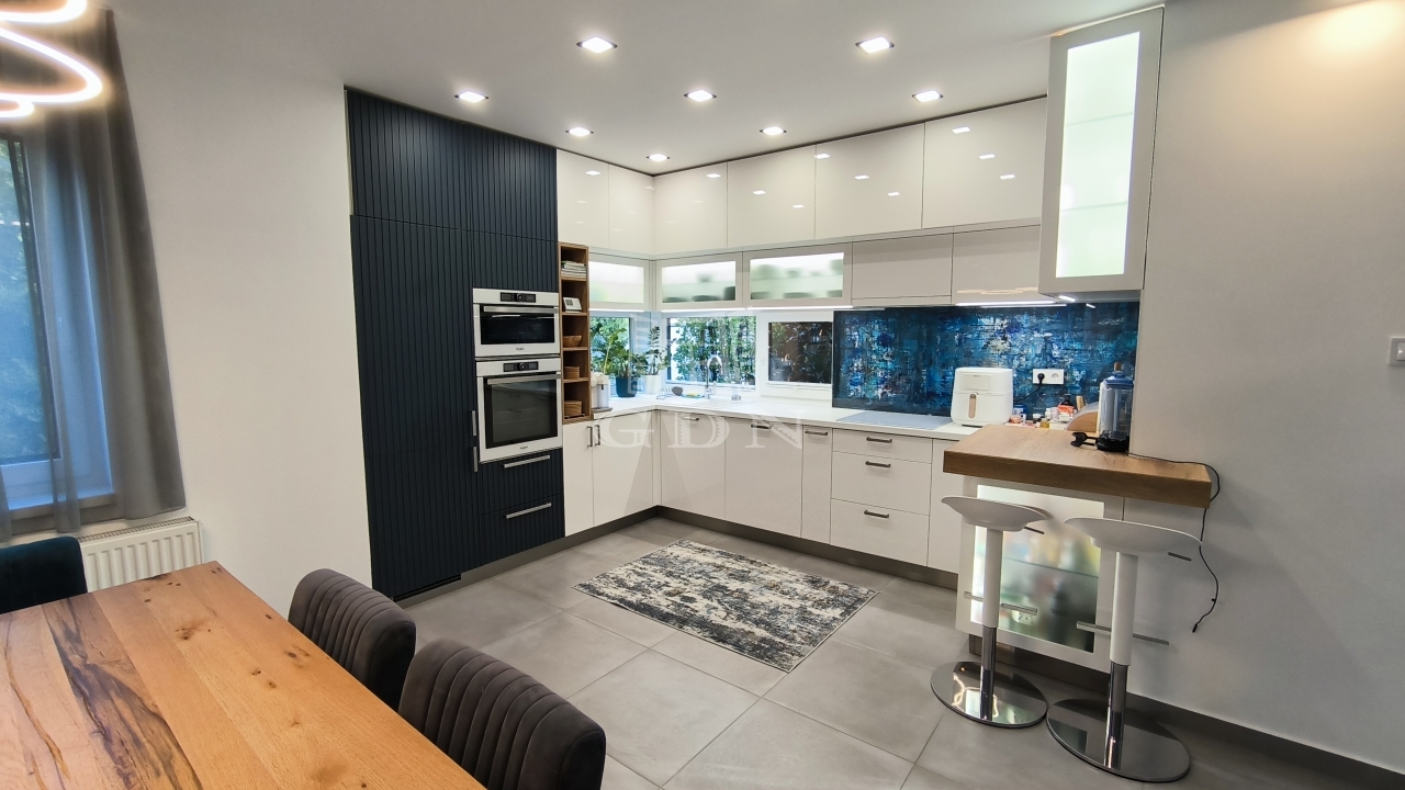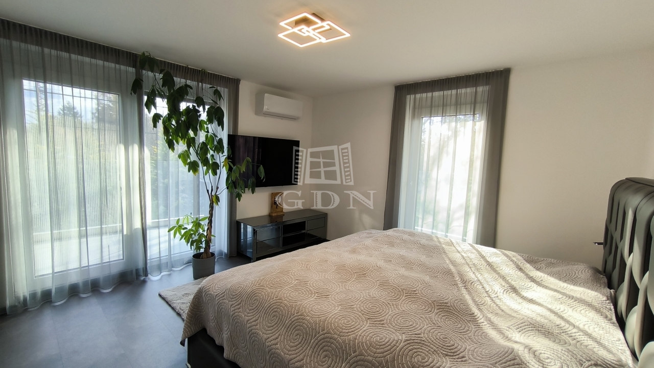 A földszinten az amerikai konyhás nappali mellett van még egy háló és egy fürdőszoba is, a lépcső alatt kis tároló. A nappaliból kilépve érünk a 34 négyzetméteres teraszra, az intimitást biztosító, karbantartott kertbe. Az emeleten 3 háló ( 2 teraszos), egy fürdő és a szauna helység található zuhanyzóval.