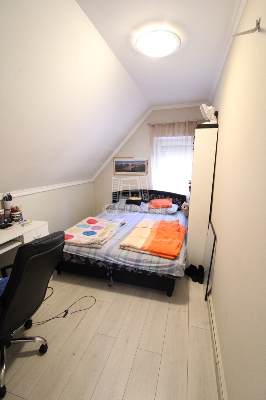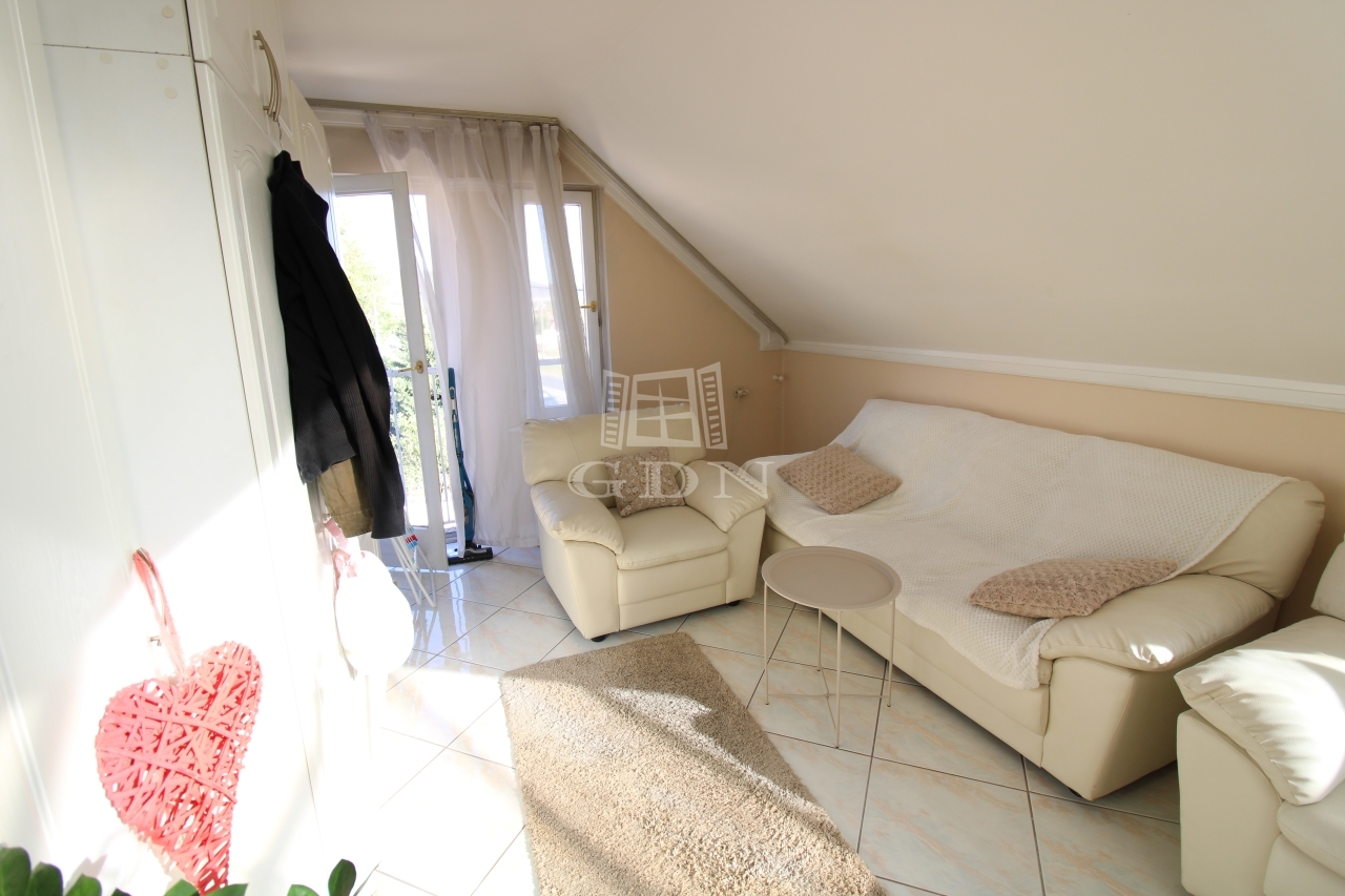Felső szintre kényelmes fokkiosztású stabil lépcsőn juthatunk fel ahol is kettő félszoba, tágas világos fürdőszoba, illemhely és egy hatalmas amerikai konyhás nappali kapott helyet