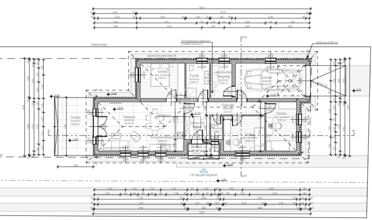 Helyiségei:nappali 18,48 m2 teraszkapcsolattal,előszoba 6,72 m2, folyosó 5,17 m2, háztartási helyiség 5,40 m2, szoba 10,50 m2, szoba 10,92 m2, wc 2,0 m2, fürdő 6,0 m2, szoba 11,40 m2, konyha-étkező 12,18 m2, garázs 18 m2, belépő 2,55 m2, terasz 14,88 m2.