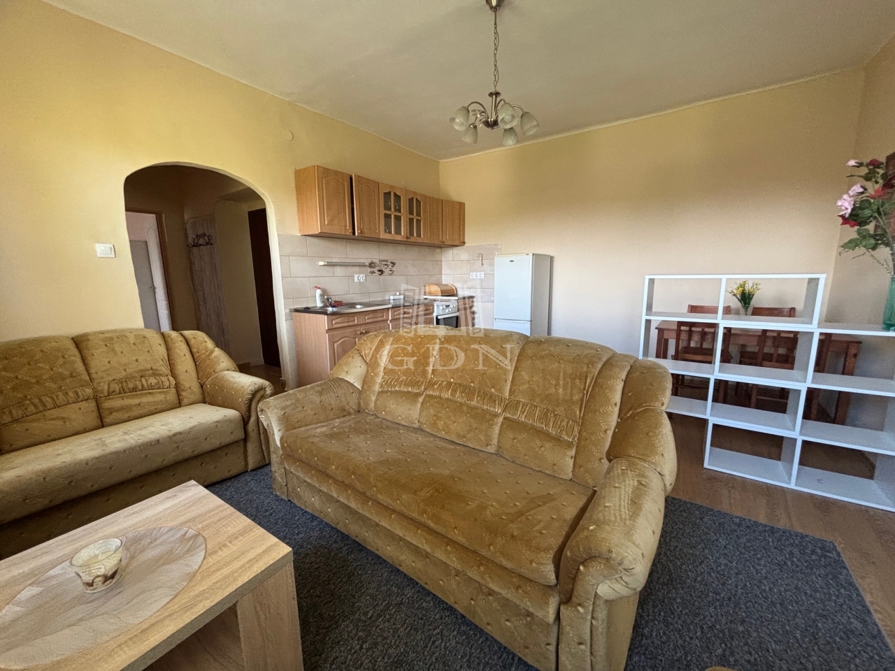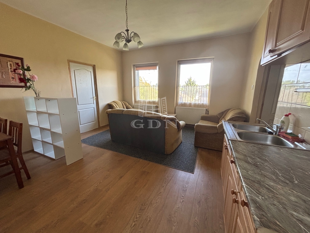 Az ingatlan a 1. emeleten helyezkedik el, 2 szobával és amerikai konyhás nappalival rendelkezik.