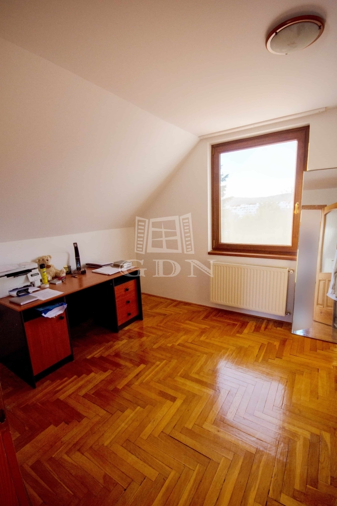 A földszinten konyha, egy hálószoba és fürdőszoba, míg az emeleten három szoba és fürdőszoba került kialakításra. Mindkét szinten terasz, a legalsó szinten pedig pince található. Az épülethez garázs is tartozik.