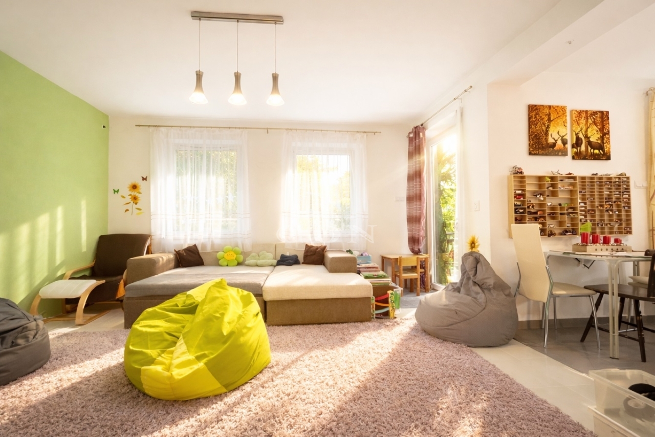 A telek 584m2, egy része térkövezett, hátsó része füvesített. A házhoz kapcsolódik egy fedett beálló és egy garázs is.