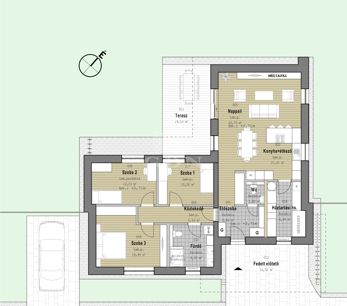 A ház központi életterét egy világos, egybefüggő nappali–étkező–konyha alkotja, amely közvetlen kapcsolatban áll a nagyméretű terasszal, így a belső és külső terek harmonikusan összekapcsolódnak. A bejárat az előszobába vezet, ahonnan külön vendég WC, valamint gardróbbal ellátott közlekedő nyílik. A konyhához közvetlenül kapcsolódik egy külön háztartási és gépészeti helyiség, amely a mindennapi életet kényelmesebbé és rendezettebbé teszi. Az előszobából induló közlekedő egy elkülönített privát zónába vezet, ahol 3 hálószoba, valamint egy zuhanyzós fürdőszoba található, amely igény szerint káddal is bővíthető.