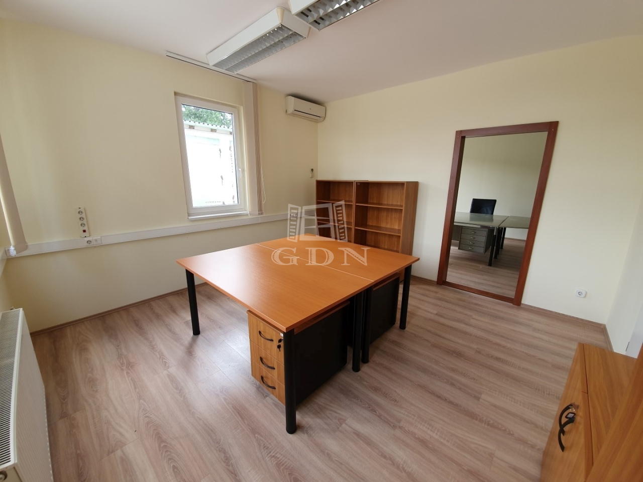Az irodaépületben egy nagy ügyfélfogadó / recepciós tér, kis teakonyha, női-férfi wc, kiszolgáló helyiség zuhanyzóval, egy kéziraktár és 5 db önálló irodahelyiség került kialakításra. Minden irodahelyiség klimatizált, bútorozott, jó állapotúak.