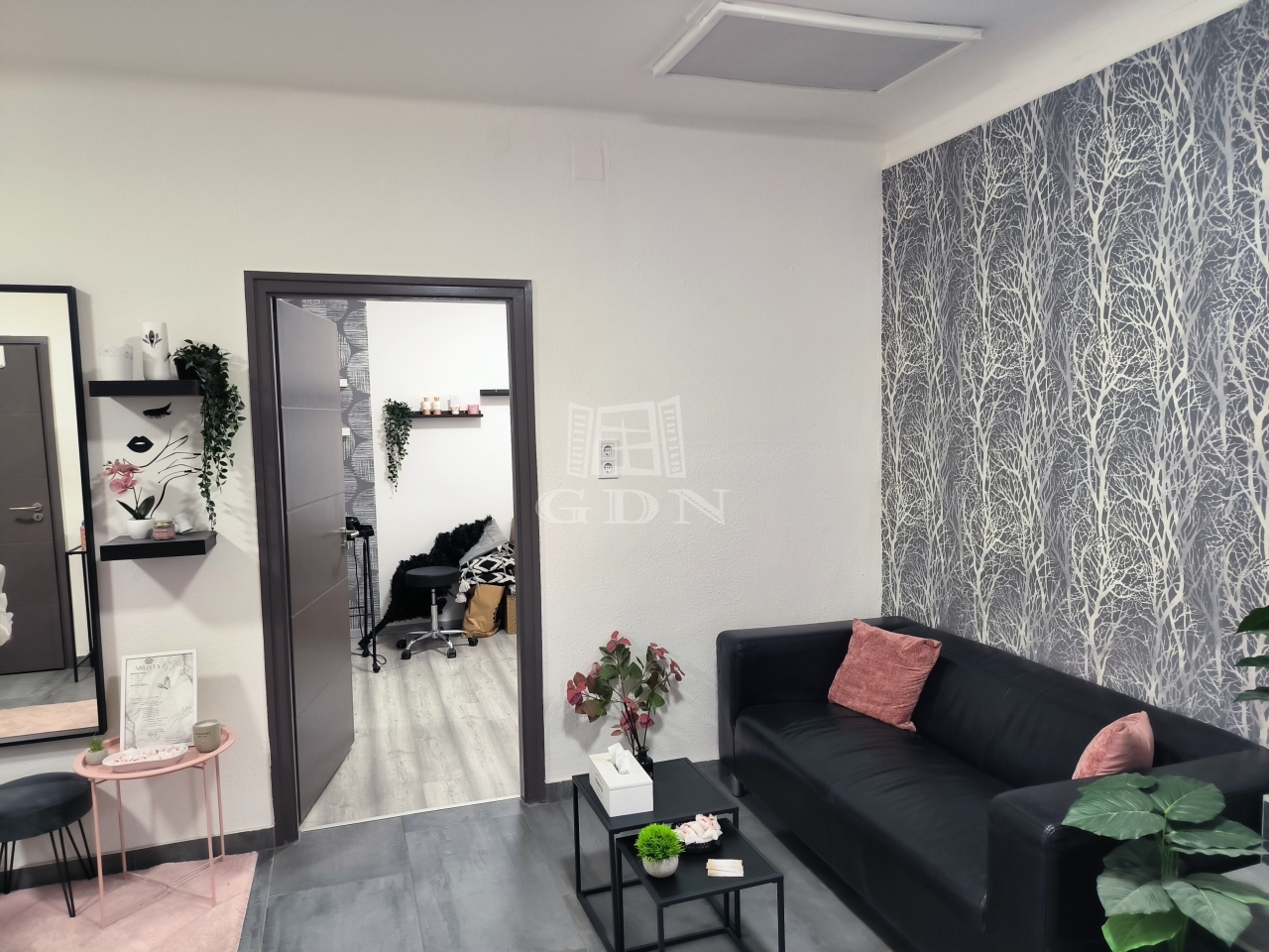 Az üzlethelyiség három egybenyíló helyiségből és egy nagyobb fogadóhelyiségből áll. A válaszfalak bonthatók vagy mozgathatók.