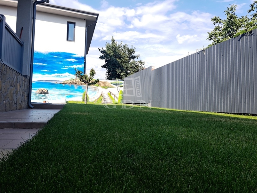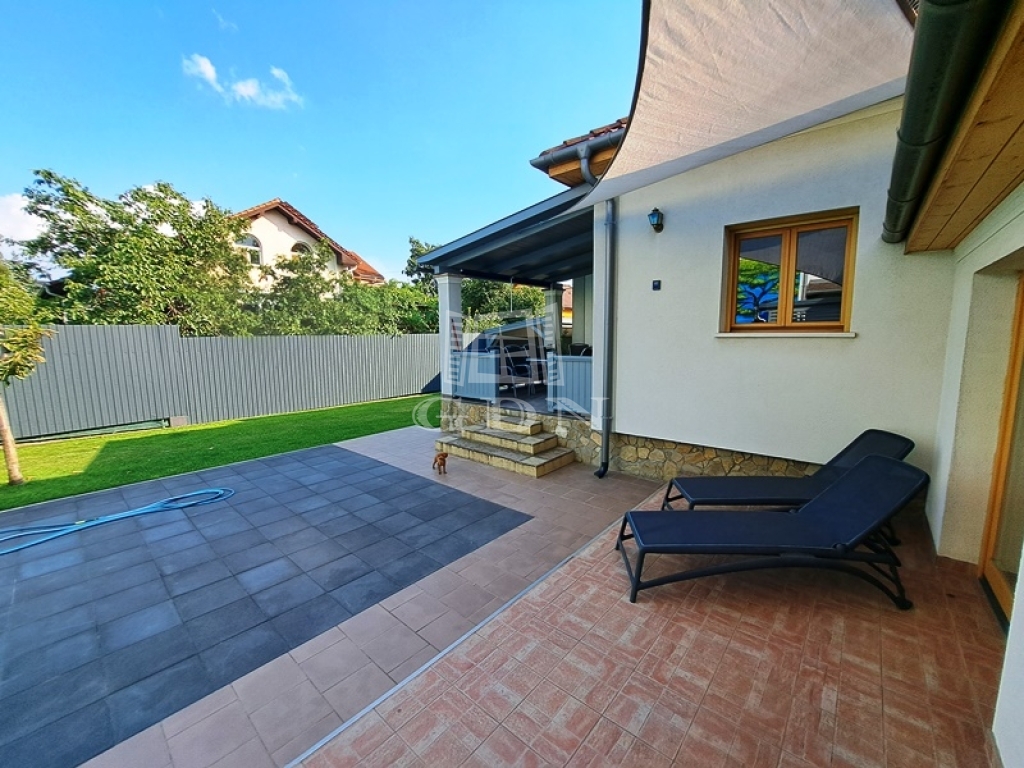 Az intim kert rendezett parkosított, két autó számára fedett autóbeálló áll rendelkezésre.A kert öntözését fúrt kút biztosítja.