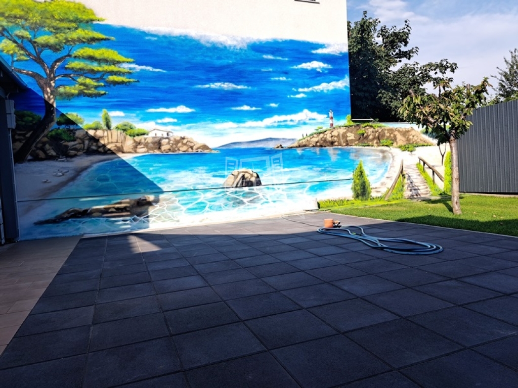 -kert rendezés, (gyepszőnyeg, falfestmény, terasz burkolat, kapu automatizálás, kaputelefon)