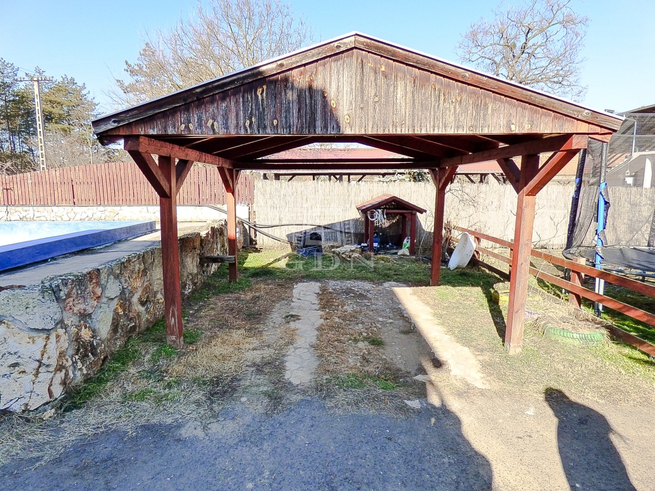Az udvaron található egy 36 nm alapterületű két szintes melléképület, amely alsó szintje garázsként, felső szintje egy külön kis lakrészként, esetleg irodaként funkcionál továbbá egy 4,2 * 7,8 m-es medence, játszótér, gyümölcsfák, fedett felszíni beálló került kialakításra.