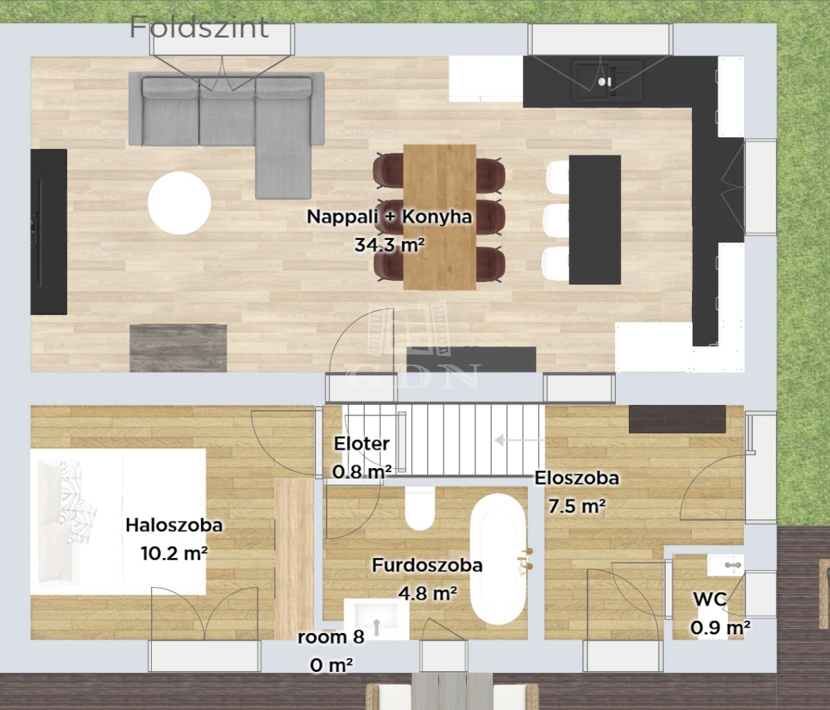 Földszint: nappali–étkező, konyha, 1 szoba, fürdőszoba, külön WC, előtér