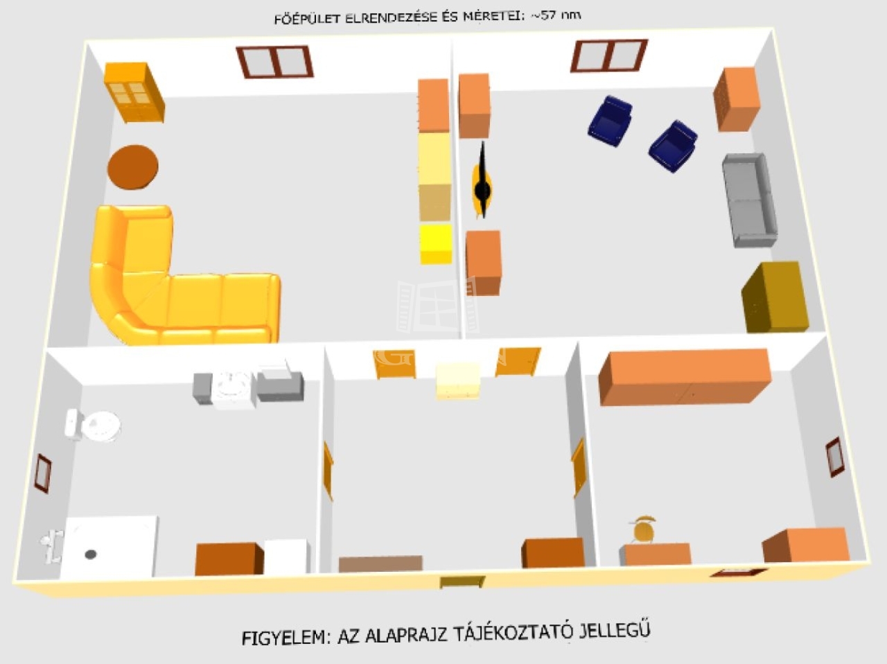A főépület hasznos alapterülete 57 nm, melyben található: