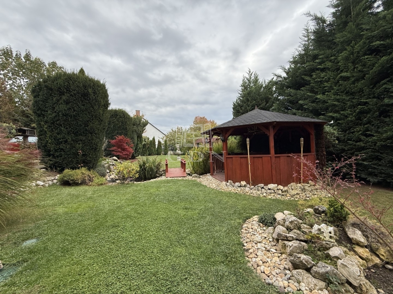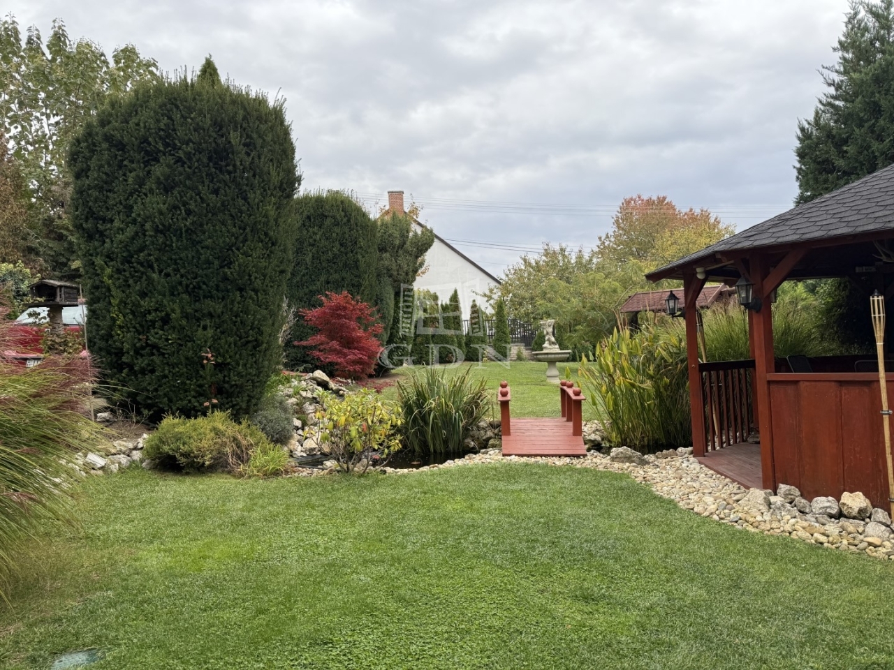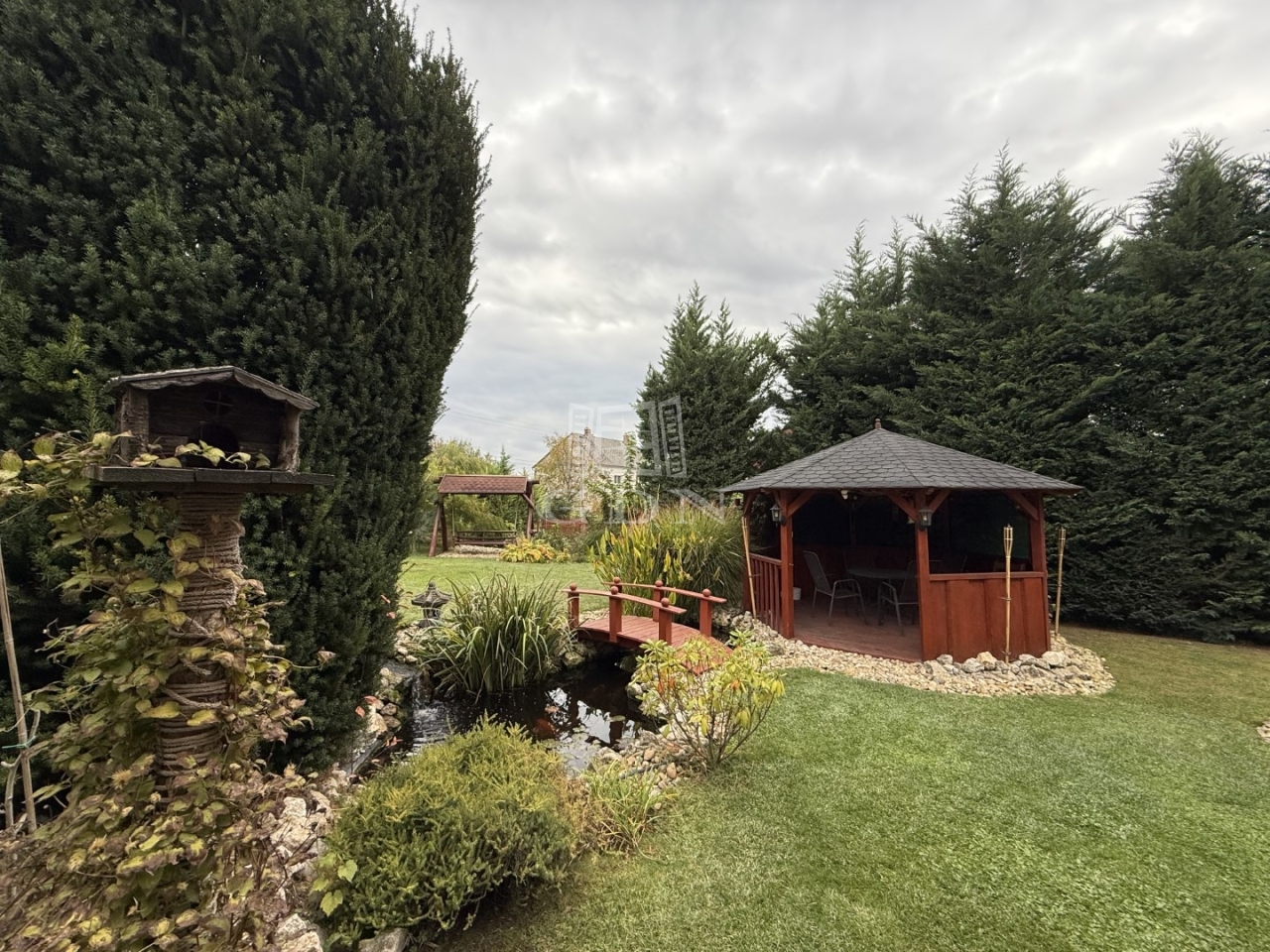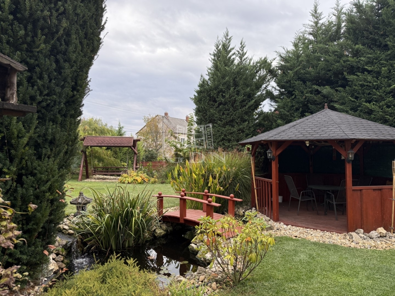 A kert öntözőrendszerrel ellátott, benne dísznövények, kis kerti tó és sütögető teszik hangulatossá a környezetet.