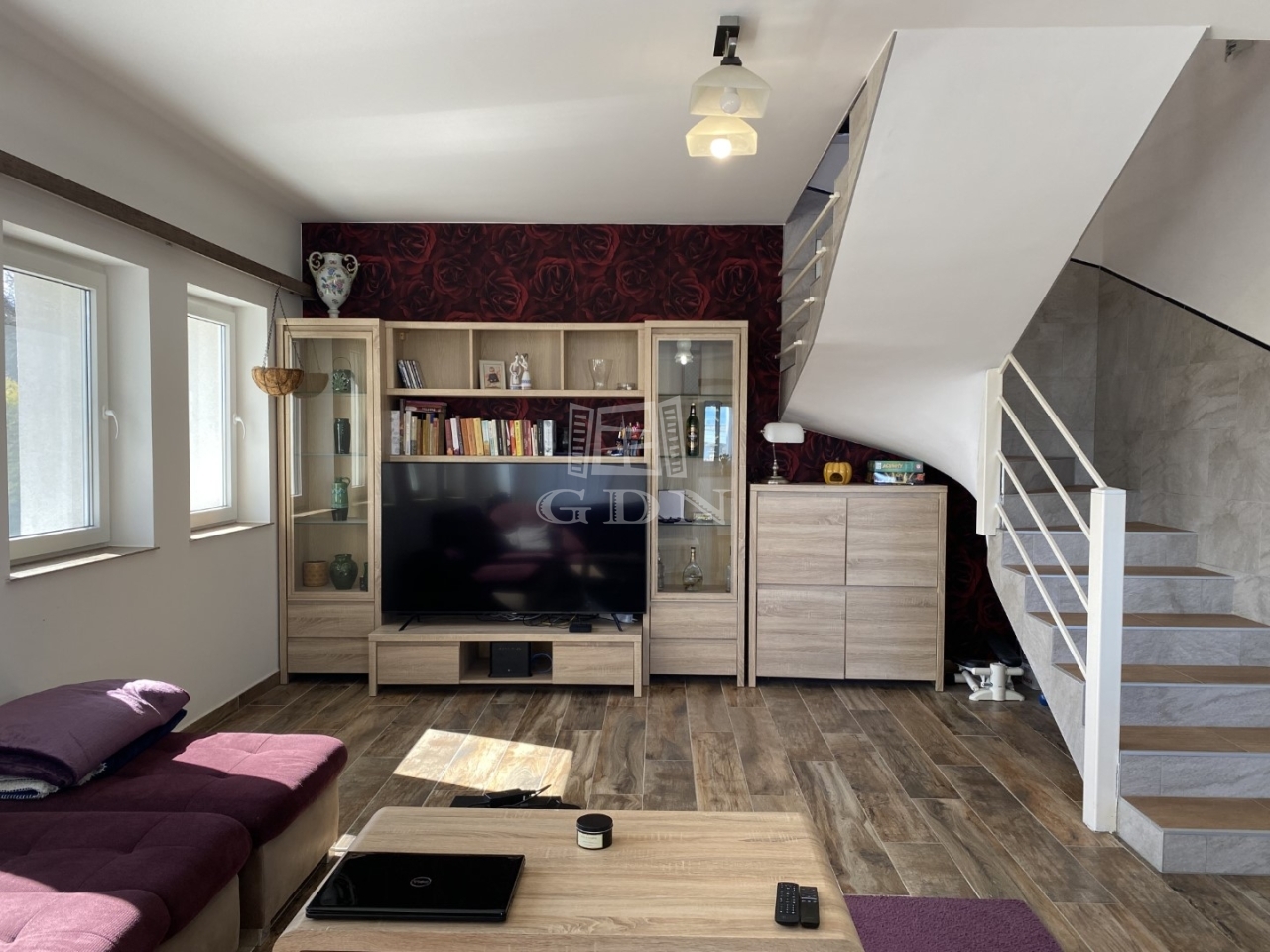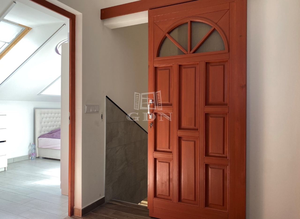 Az épület hátsó oldalán egy lakrész került kialakításra. Elosztását tekintve 120m2 hasznos alapterületű. A földszinten egy előszoba, amerikai konyhás nappali, fürdőszoba WC-vel, a tetőtérben pedig 4 hálószoba található.