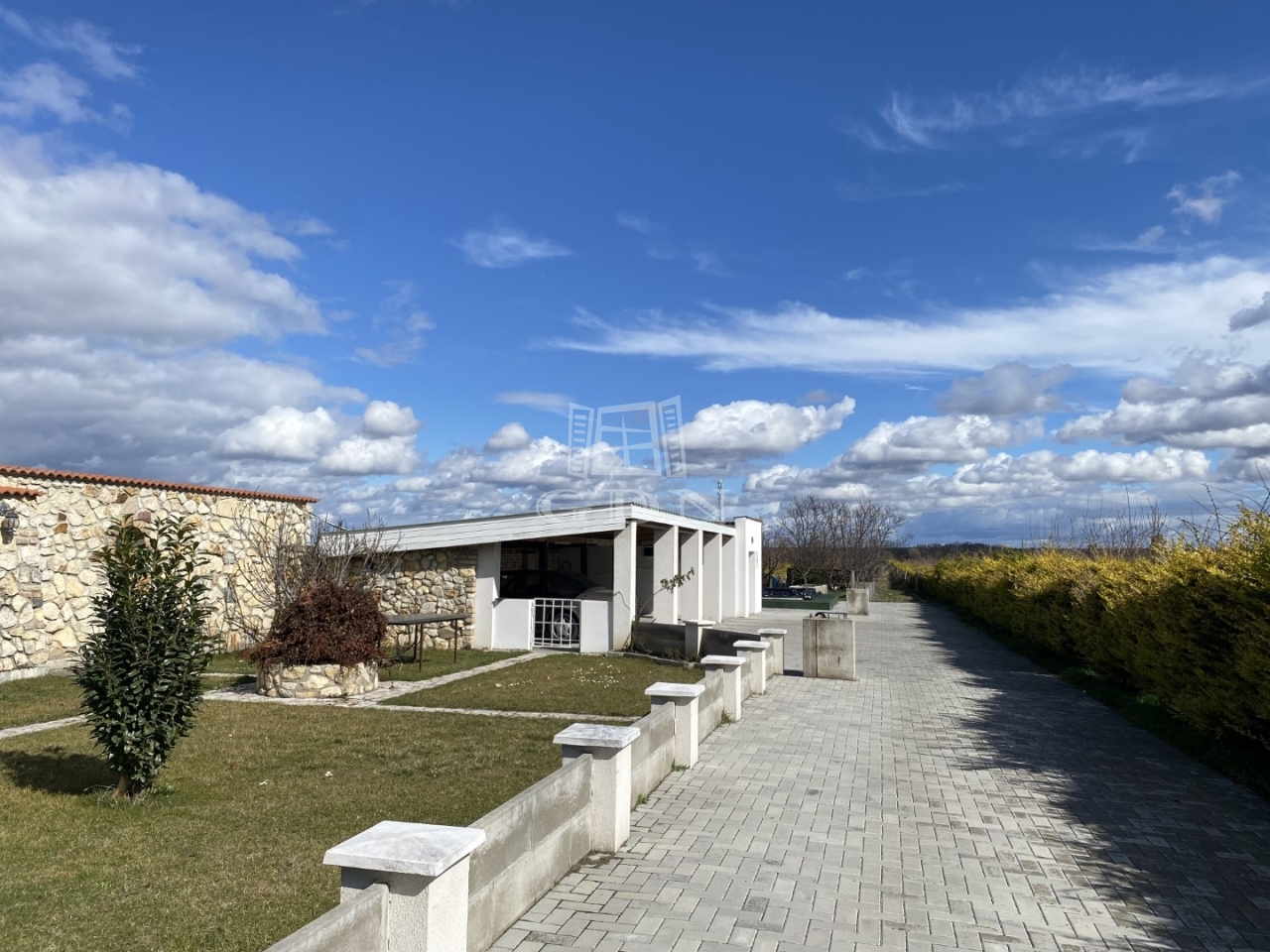 A telek 7698m2-es, teljesen körbekerített. A gépjárművel való bejutás elektromos kapun keresztül biztosított. Az udvaron található egy 4 állásos autóbeálló, egy nyári konyha-dühöngő, illetve egy medence is. A telek ¾ része jelenleg csak füvesített, a fennmaradó rész teljesen parkosított, örökzöldekkel beültetett közel 700m2 része teljesen térkövezett. Található rajta egy kút is, ami bő vízhozamának köszönhetően lehetőséget ad a kert locsolásához is.