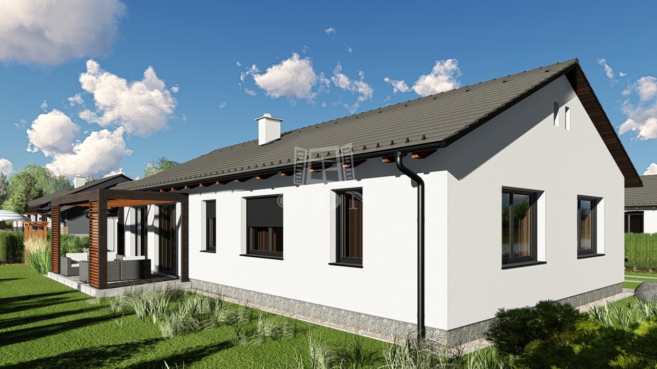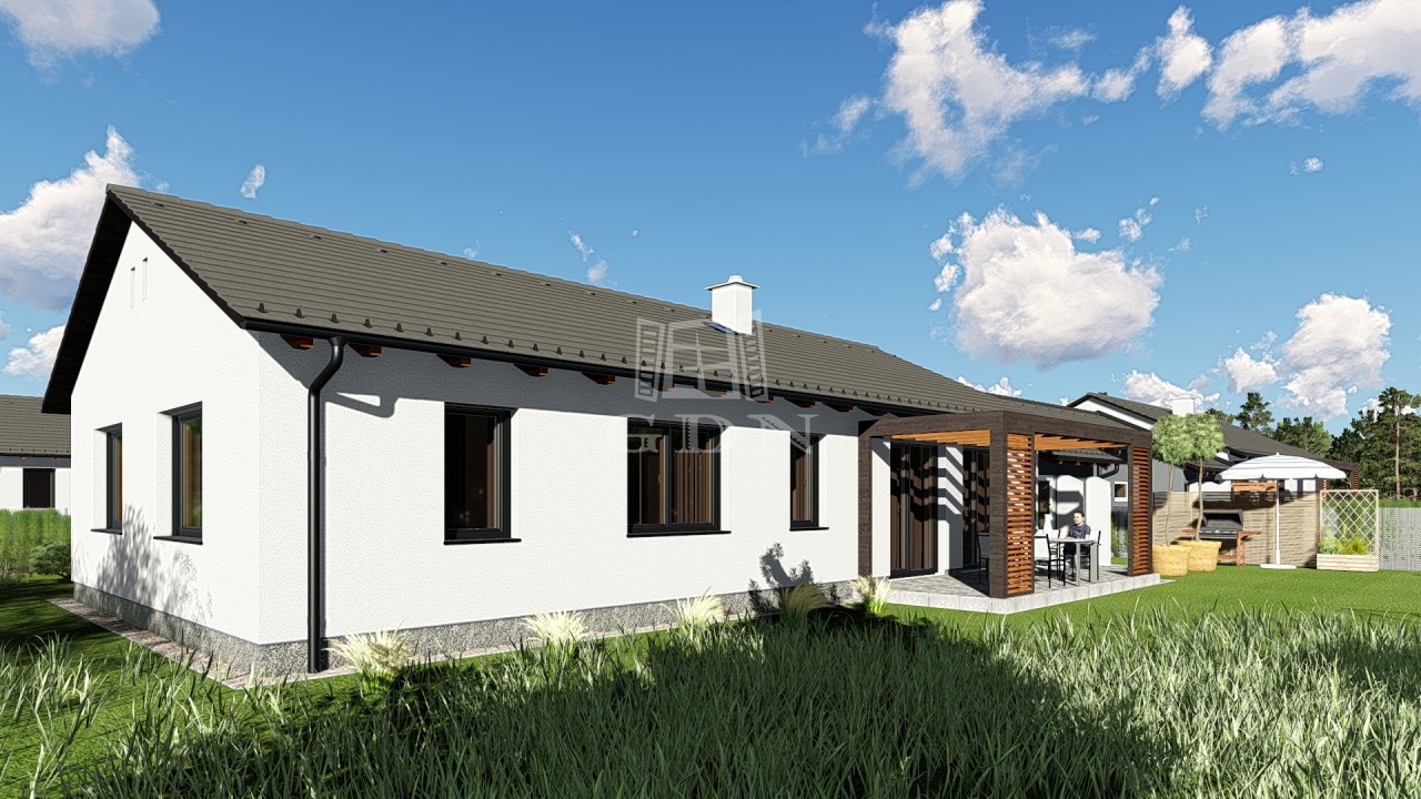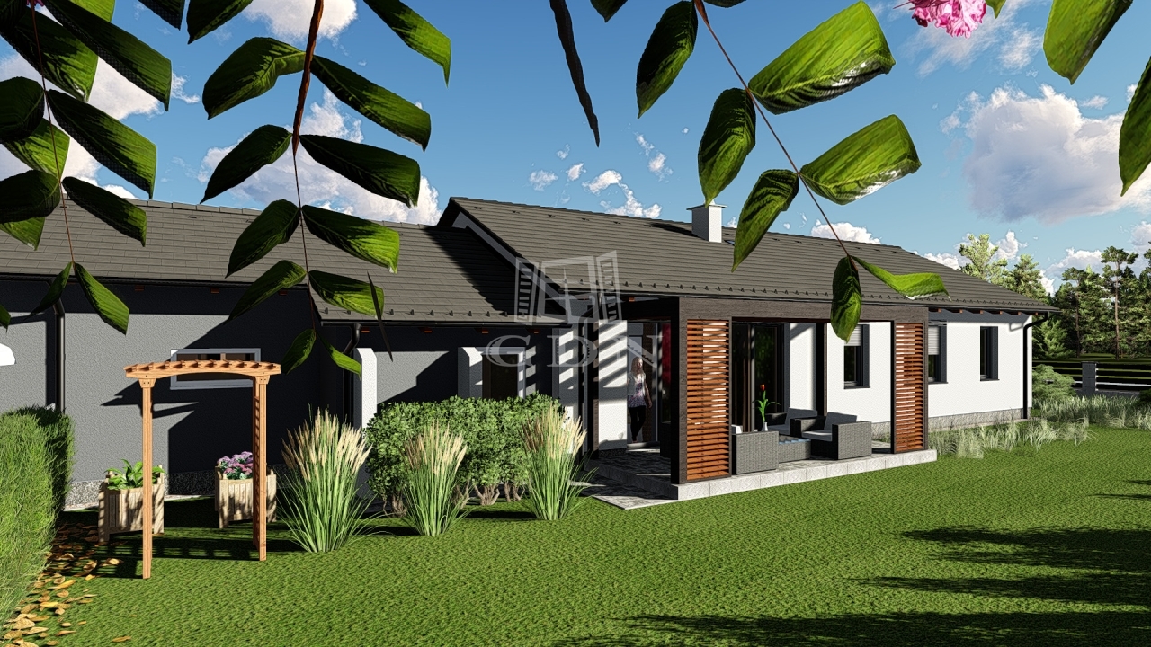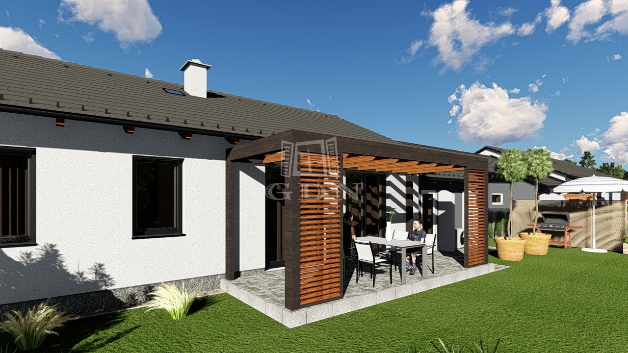 A lakóegység hasznos alapterülete 123 m², és modern, jól átgondolt elrendezéssel rendelkezik: előszoba, közlekedő, két hálószoba, étkezős konyha, világos nappali, fürdőszoba, külön WC, gardrób, háztartási helyiség, nagy terasz, valamint garázs.